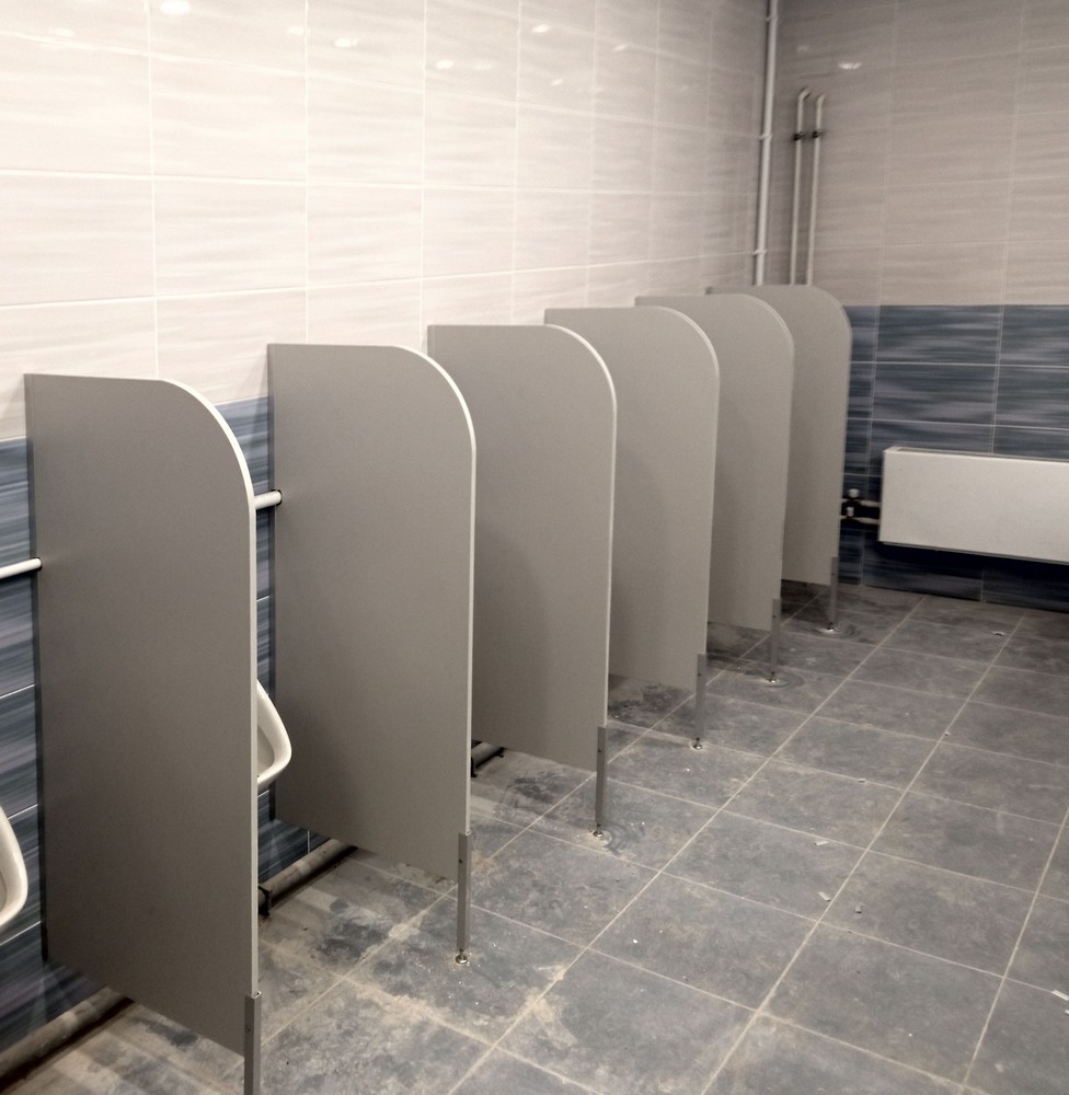 Фасадные перегородки включают: фасадные панели с нанесённой ПВХ кромкой по нижнему краю, дверь укороченная с нанесённой ПВХ кромкой по периметру, неразъёмные оцинкованные стальные петли, обвязочный и монтажные профили в комплекте, резьбовые ножки из оцинкованной стали и метизы.
